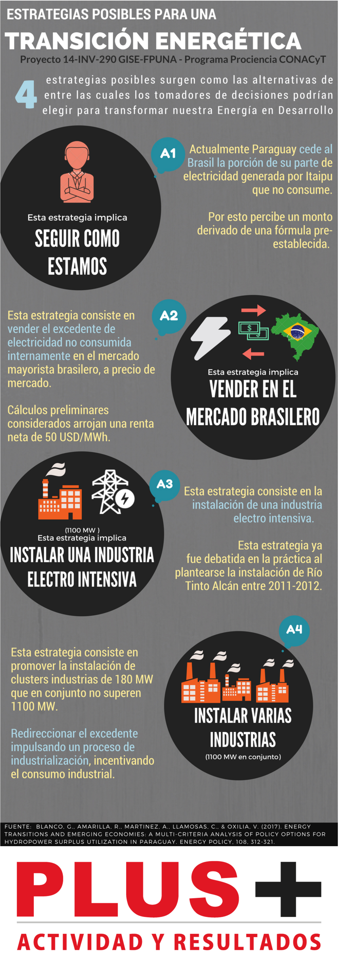 Esta situación y la inminente necesidad de analizar en profundidad las potenciales políticas de uso de los excedentes más beneficiosas para el Paraguay de cara a la próxima renegociación del Anexo C del Tratado de Itaipú en 2023, se planteó en el artículo recientemente publicado por el GISE en la prestigiosa revista científica Energy Policy, donde se consideraron cuatro opciones de políticas públicas o estrategias, de las cuales tres ya tuvieron un amplio debate en el país: