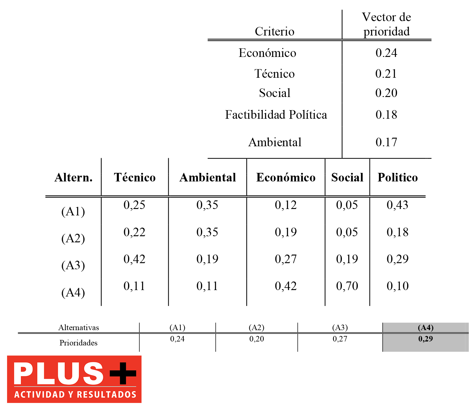 Además, los cinco criterios (económico, técnico, social, ambiental y político) se clasificaron en función de su grado de importancia, basándose en los resultados de una encuesta realizada entre 80 agentes socio-económicos para recoger información sobre sus preferencias cardinales de los criterios en una escala del 1 a 9.