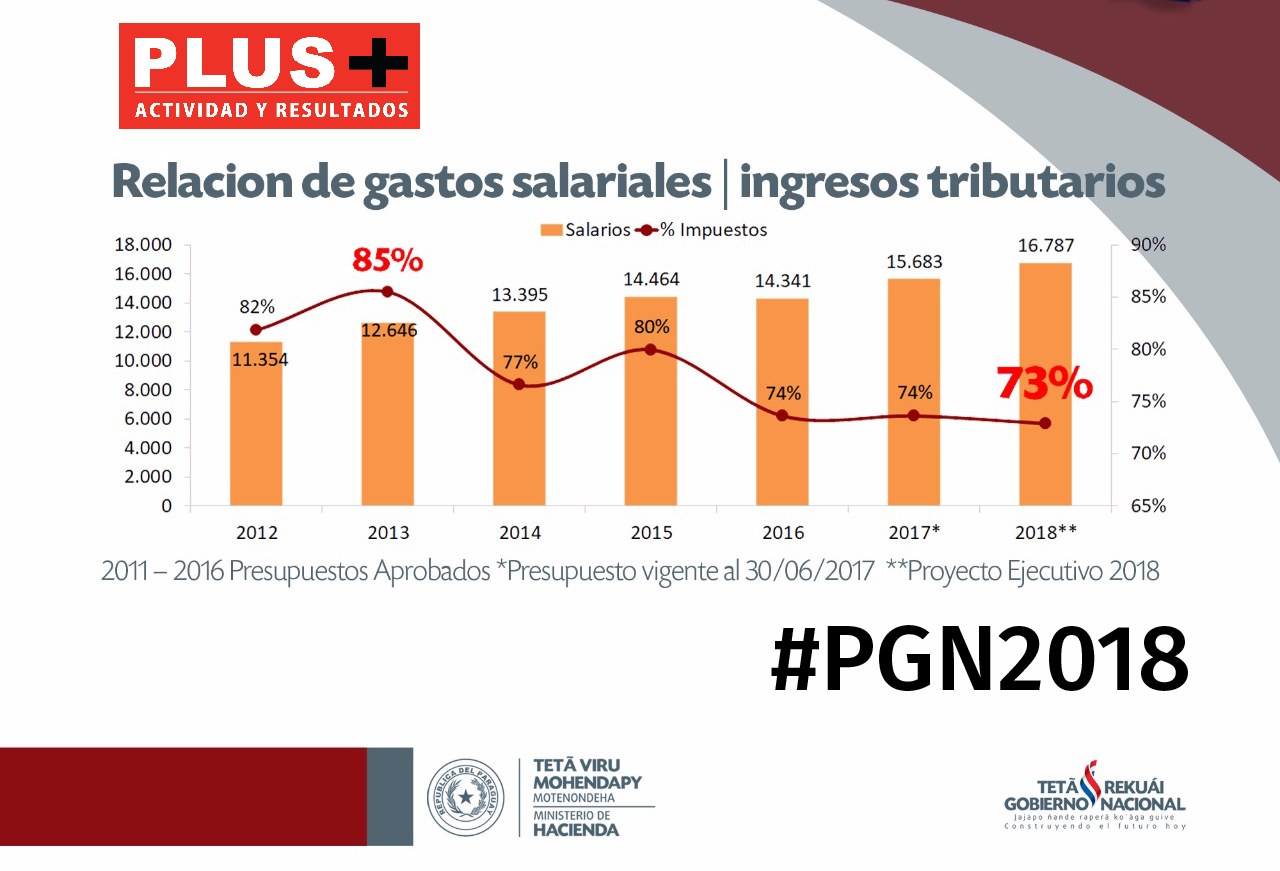 Actualmente, G. 74 de cada 100 de impuestos recaudados se destinan para al financiamiento de gastos salariales y se prevé que esta relación disminuya a G. 73 por cada G. 100 en el proyecto del PGN 2018.