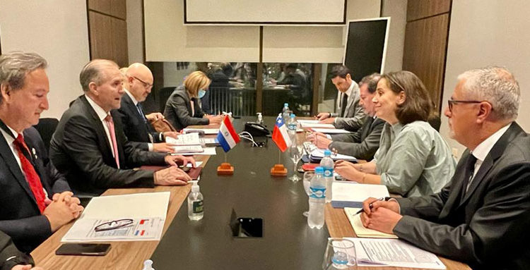 Asunción, Agencia IP.- El canciller nacional, Julio César Arriola, se reunió con la ministra de Relaciones Exteriores de Chile, Antonia Urrejola, ocasión en la que abordaron temas de la agenda bilateral. Así también acordaron la realización de una reunión de consultas políticas, para la primera quincena de diciembre.