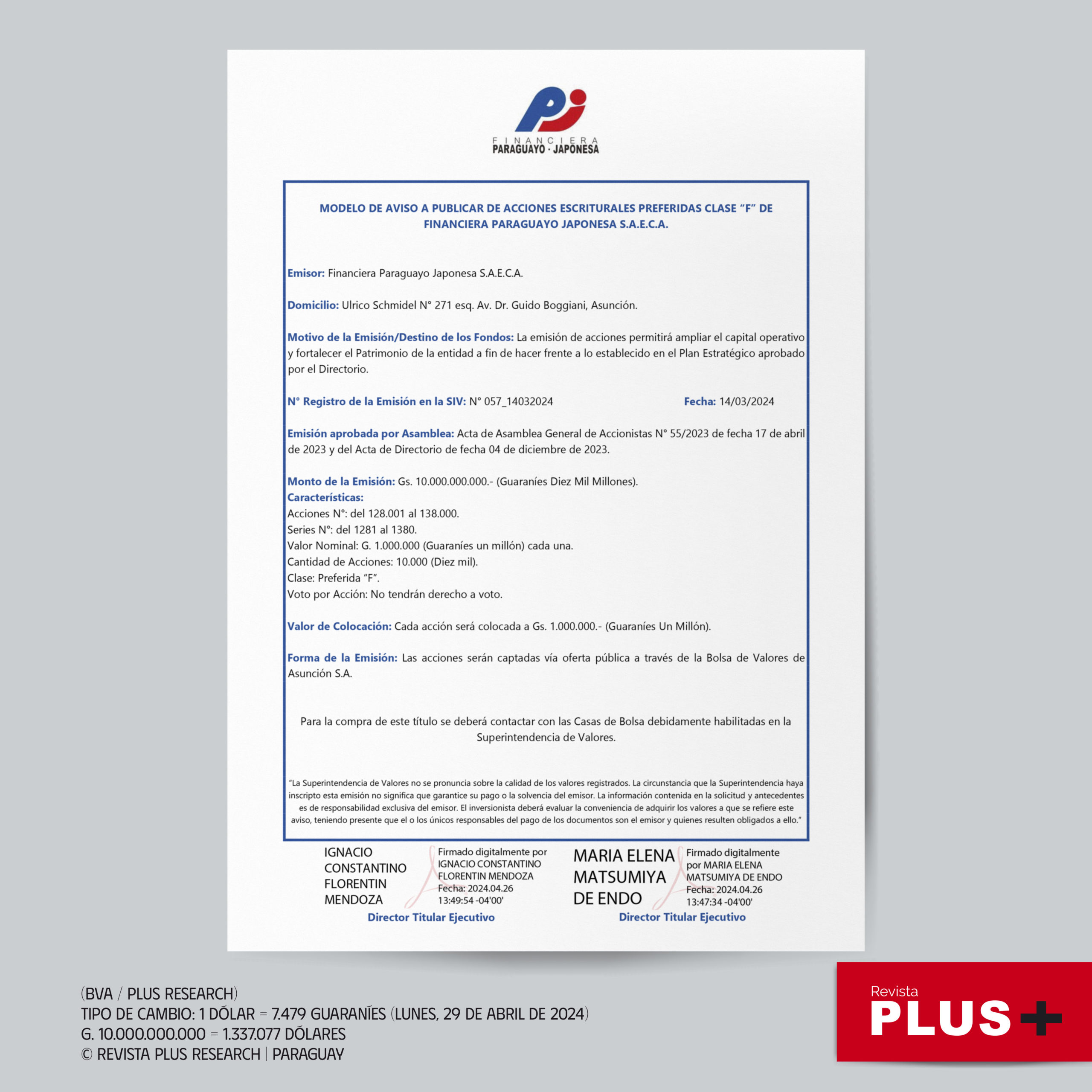 El lunes 29 de abril, Financiera Paraguayo Japonesa emitió acciones preferidas escriturales de forma electrónica en el parqué asunceno, alcanzando una demanda que superó ampliamente el monto ofertado de G. 10.000 millones.