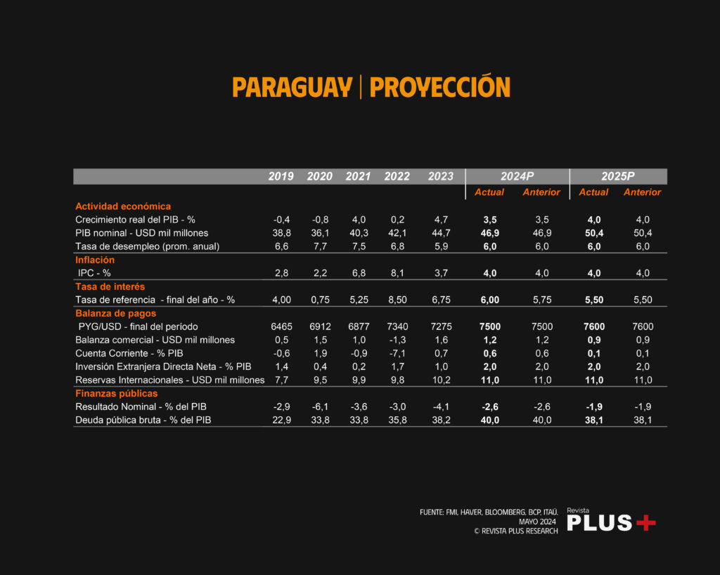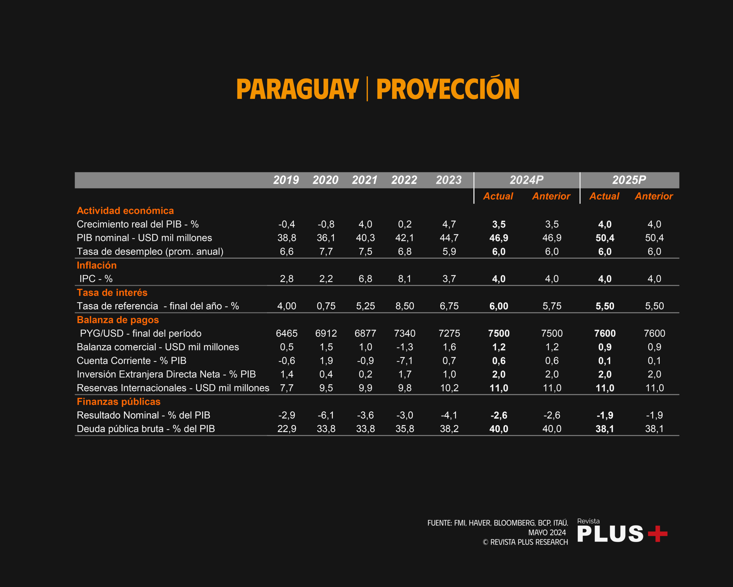 En cuanto a la actividad económica, los indicadores adelantados sugieren un inicio positivo para el segundo trimestre de 2024. El Indicador Mensual de Actividad Económica (IMAEP) mostró una expansión del 5,0% mensual en abril, llevando el crecimiento trimestral a un sólido 2,7%. Esto respalda la previsión de Itaú de un crecimiento del PIB de 3,5% para 2024, con un sesgo al alza.