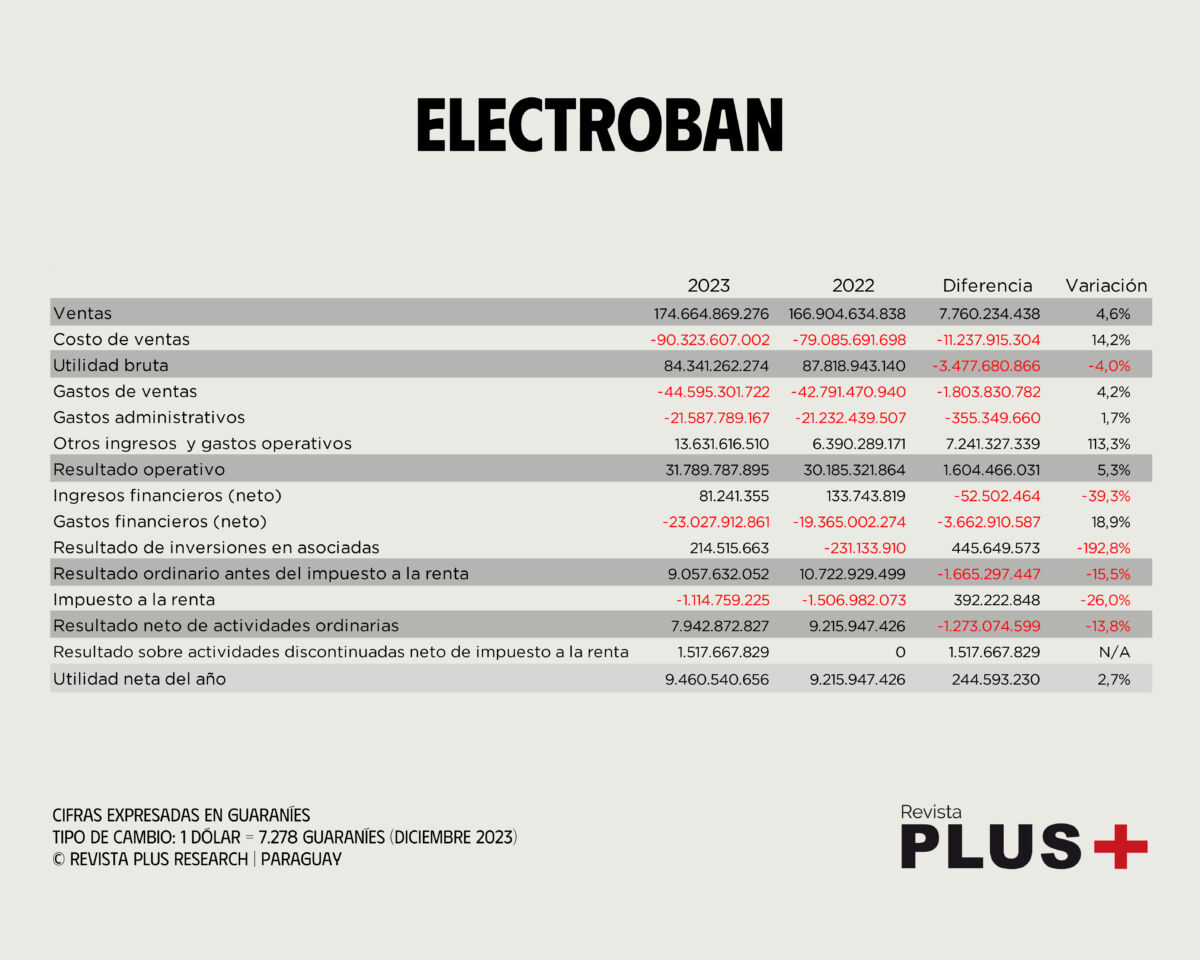 Electroban cerró el ejercicio fiscal 2023 con un beneficio de G. 9.460 millones (US$ 1,29 millones) un incremento del 2,7% con relación al año precedente.