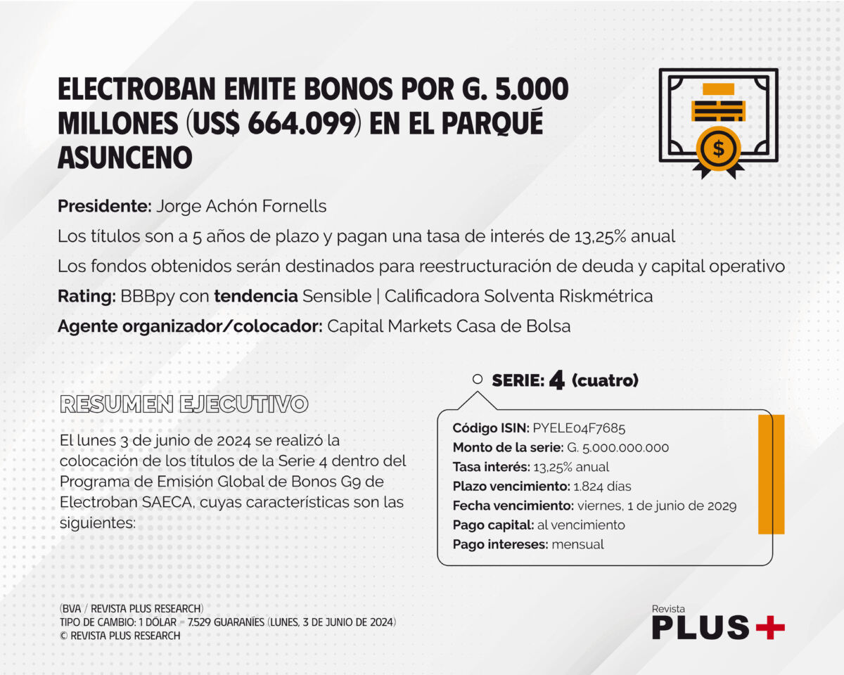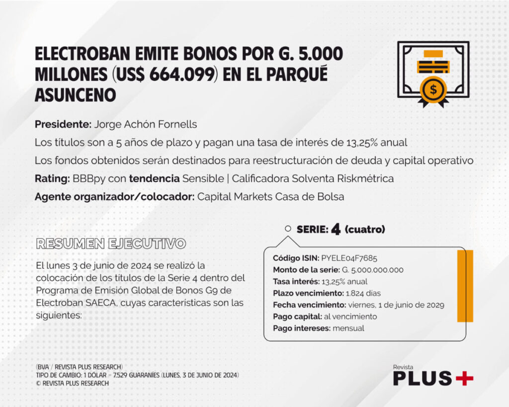 El lunes 3 de junio de 2024 se realizó la colocación de los títulos de la Serie 4 dentro del Programa de Emisión Global de Bonos G9 de Electroban SAECA, cuyas características son las siguientes: