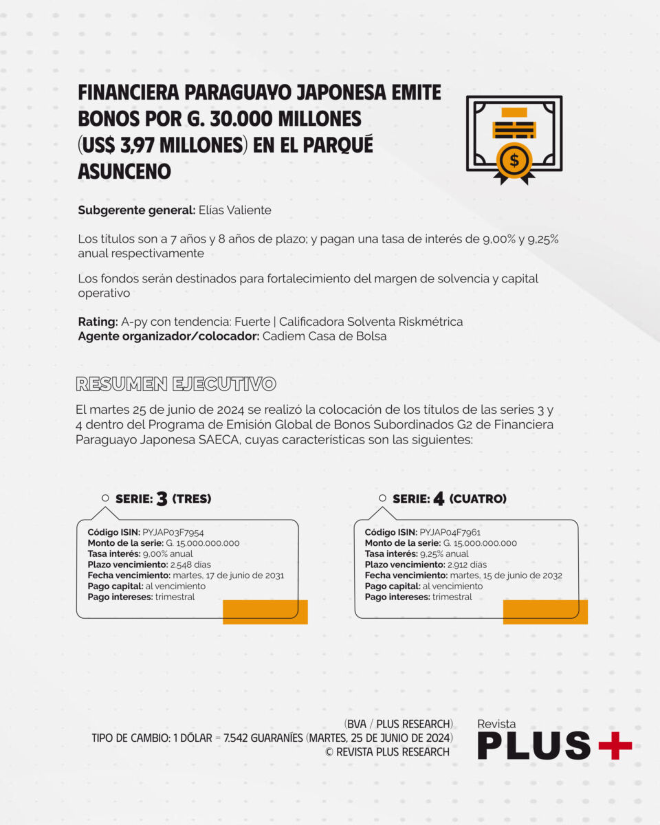 El martes 25 de junio de 2024 se realizó la colocación de los títulos de las series 3 y 4 dentro del Programa de Emisión Global de Bonos Subordinados G2 de Financiera Paraguayo Japonesa SAECA, cuyas características son las siguientes: