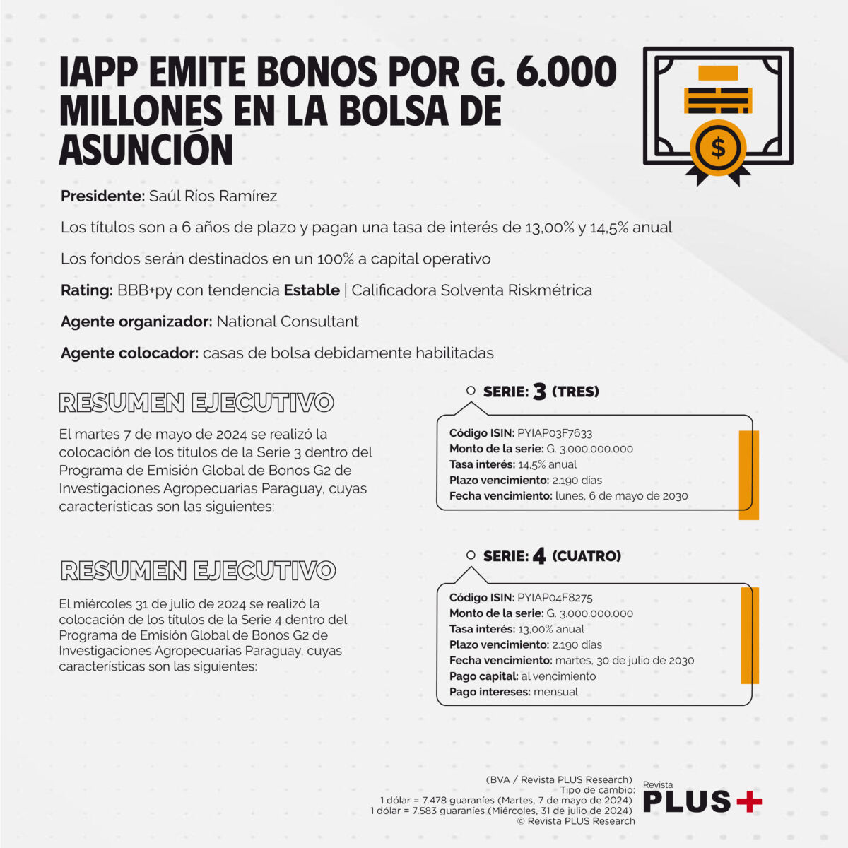 El miércoles 31 de julio de 2024 se realizó la colocación de los títulos de la Serie 4 dentro del Programa de Emisión Global de Bonos G2 de Investigaciones Agropecuarias Paraguay, cuyas características son las siguientes: