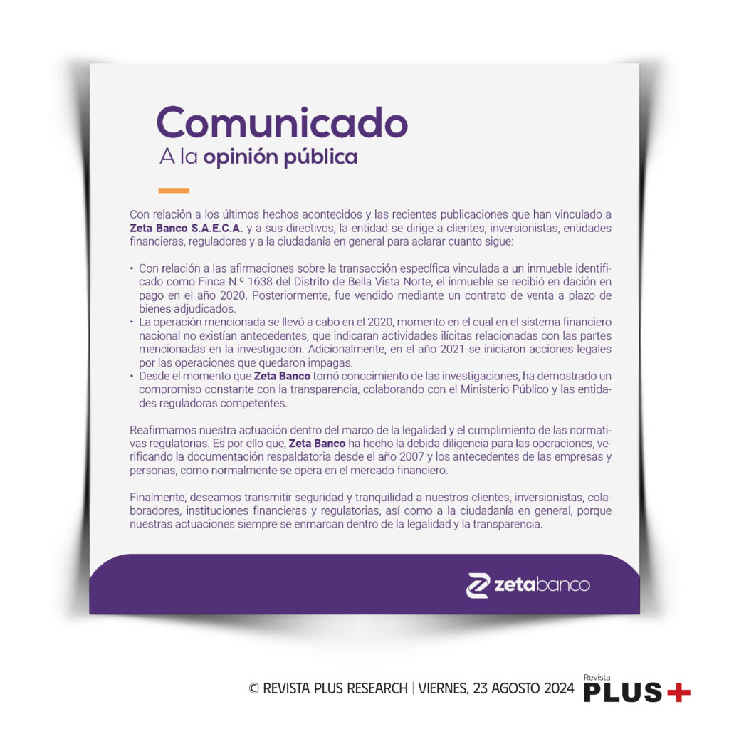 Finalmente, Zeta Banco asegura que actúa dentro del marco de la legalidad y el cumplimiento de las normativas regulatorias, realizando la debida diligencia para las operaciones, verificando la documentación respaldatoria desde el año 2007 y los antecedentes de las empresas y personas, como normalmente se opera en el mercado financiero.