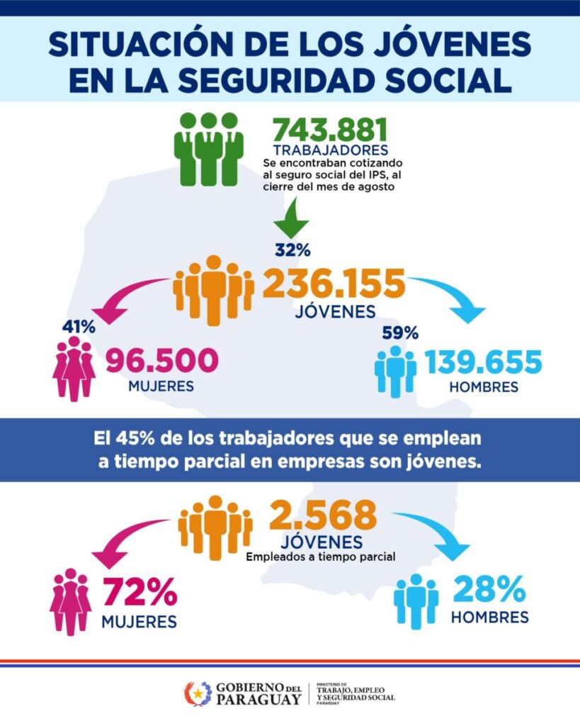 El Ministerio de Trabajo, Empleo y Seguridad Social (Mtess) realizó un análisis de los datos del IPS para determinar la participación del sector juvenil en el Seguro Social. Los resultados revelan que de los 743.881 trabajadores que cotizaron al IPS hasta agosto de este año, un 32%, es decir, 236.155 personas corresponden a jóvenes.