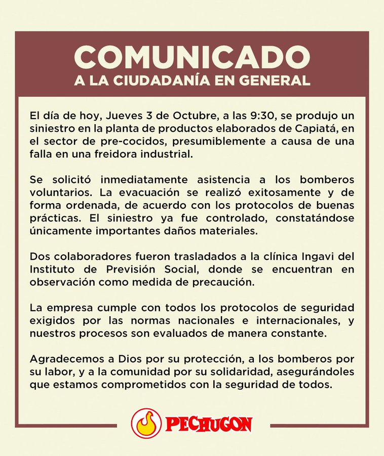 Asunción (Paraguay).- La empresa Pechugón informó que este jueves a las 09:30, se produjo un siniestro en la planta de productos elaborados de la ciudad de Capiatá, en el sector de precocidos, presumiblemente a causa de una falla en una freidora industrial.