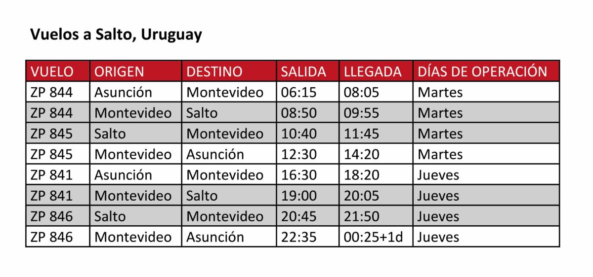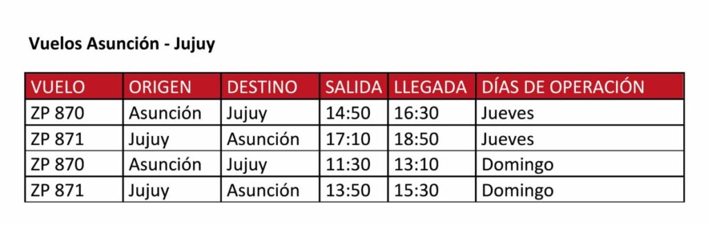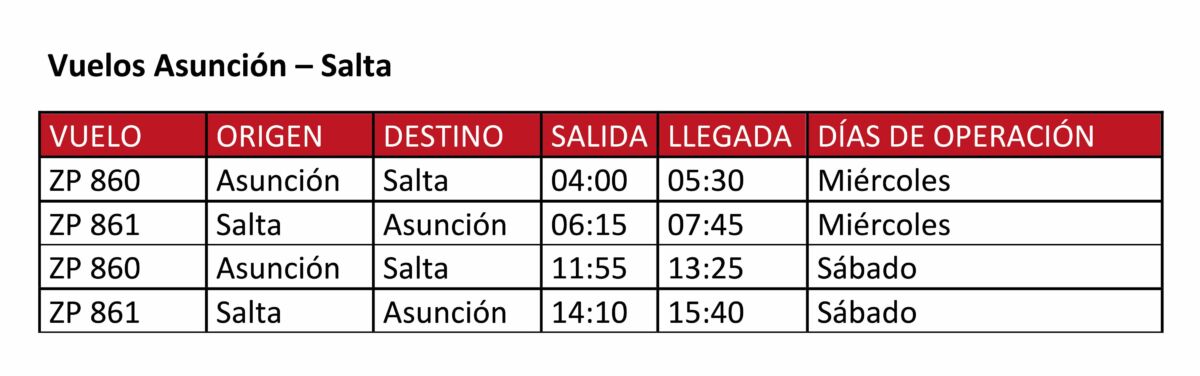 La reapertura de la ruta que unirá nuevamente Asunción con la ciudad de Salta, será oficial en febrero del próximo año. El vuelo tendrá dos frecuencias semanales los miércoles y sábado en el siguiente horario: