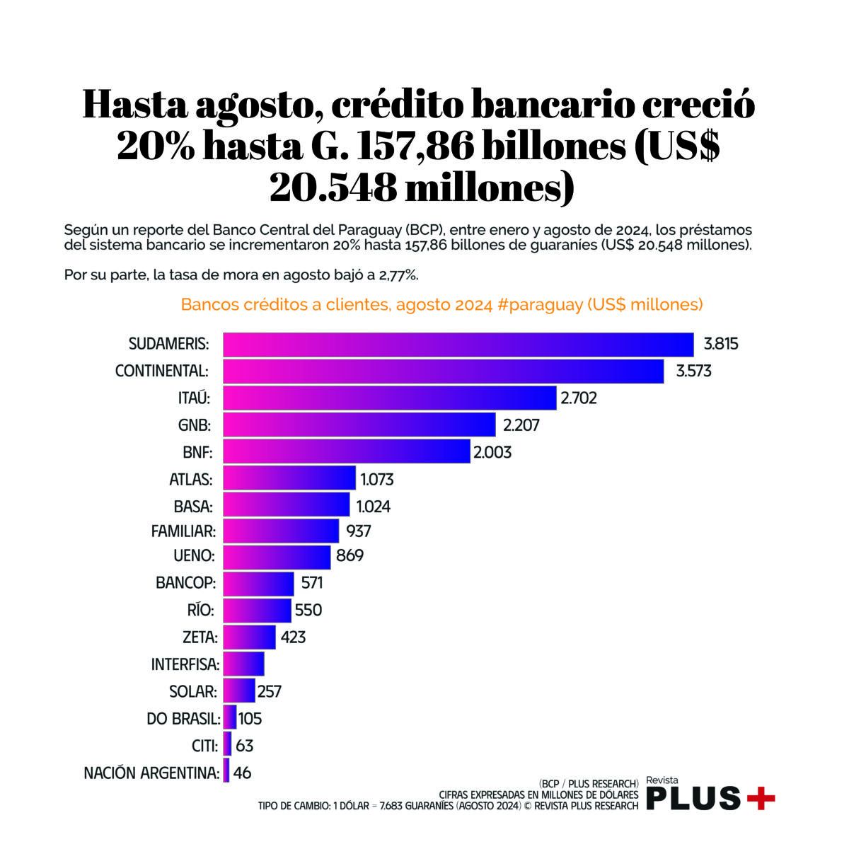 Según un reporte del Banco Central del Paraguay (BCP), entre enero y agosto de 2024, los préstamos del sistema bancario se incrementaron 20% hasta 157,86 billones de guaraníes (US$ 20.548 millones).