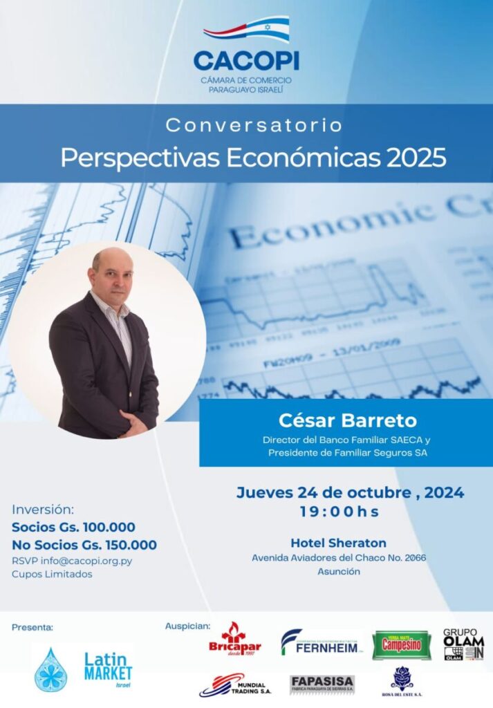 La Cámara de Comercio Paraguayo-Israelí (CACOPI) invita cordialmente al conversatorio «Perspectivas Económicas 2025», a cargo del economista César Barreto, ex Ministro de Hacienda y actual director de Banco Familiar quien compartirá su análisis sobre las principales proyecciones económicas para el 2025, así como los desafíos y oportunidades que enfrenta Paraguay en el panorama económico internacional.