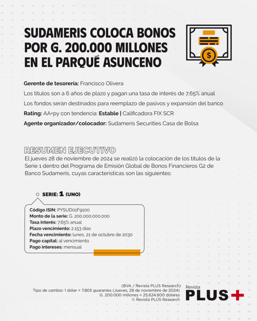 El jueves 28 de noviembre de 2024 se realizó la colocación de los títulos de la Serie 1 dentro del Programa de Emisión Global de Bonos Financieros G2 de Banco Sudameris, cuyas características son las siguientes: