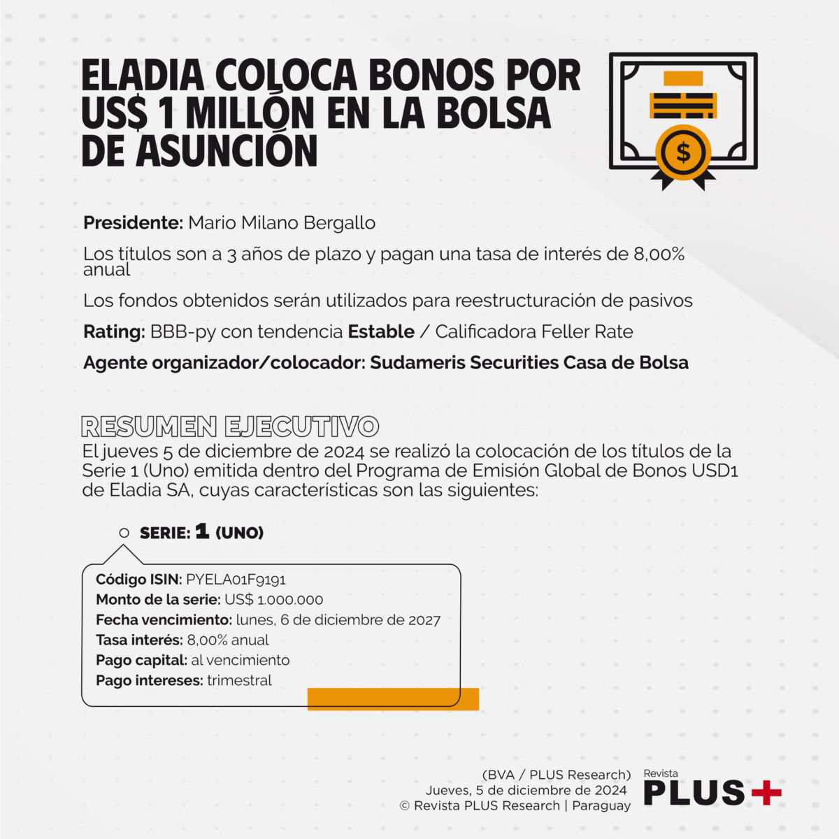 El jueves 5 de diciembre de 2024 se realizó la colocación de los títulos de la Serie 1 (Uno) emitida dentro del Programa de Emisión Global de Bonos USD1 de Eladia SA, cuyas características son las siguientes:
