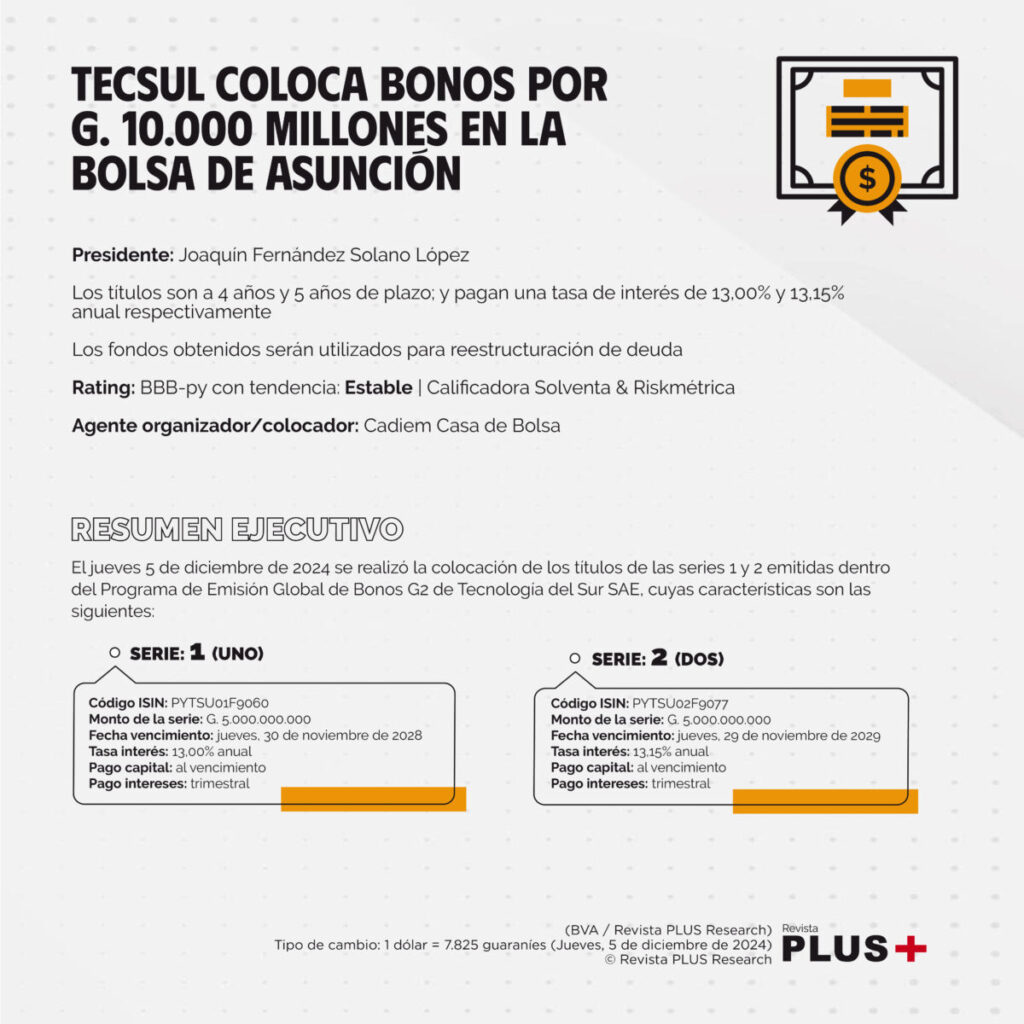 El jueves 5 de diciembre de 2024 se realizó la colocación de los títulos de las series 1 y 2 emitidas dentro del Programa de Emisión Global de Bonos G2 de Tecnología del Sur SAE, cuyas características son las siguientes: