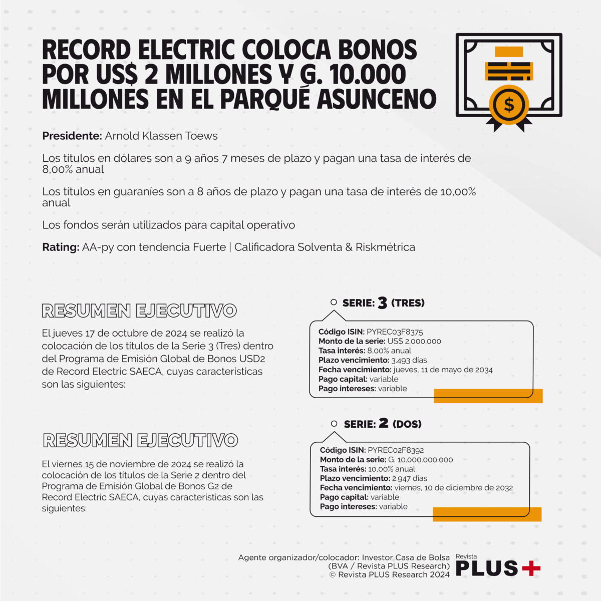 El jueves 17 de octubre de 2024 se realizó la colocación de los títulos de la Serie 3 (Tres) dentro del Programa de Emisión Global de Bonos USD2 de Record Electric SAECA, cuyas características son las siguientes: