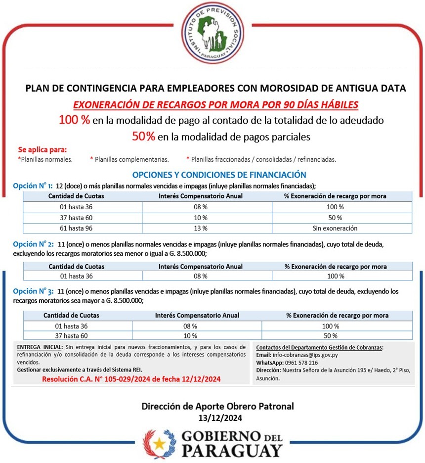 La Dirección de Apoyo Obrero Patronal (AOP) del IPS ha sido autorizada para implementar un plan de contingencia dirigido a empleadores con deudas por morosidad de antigua data. La medida, oficializada a través de la Resolución N° 105-029/2024, tiene como objetivo facilitar la regularización de pagos pendientes.