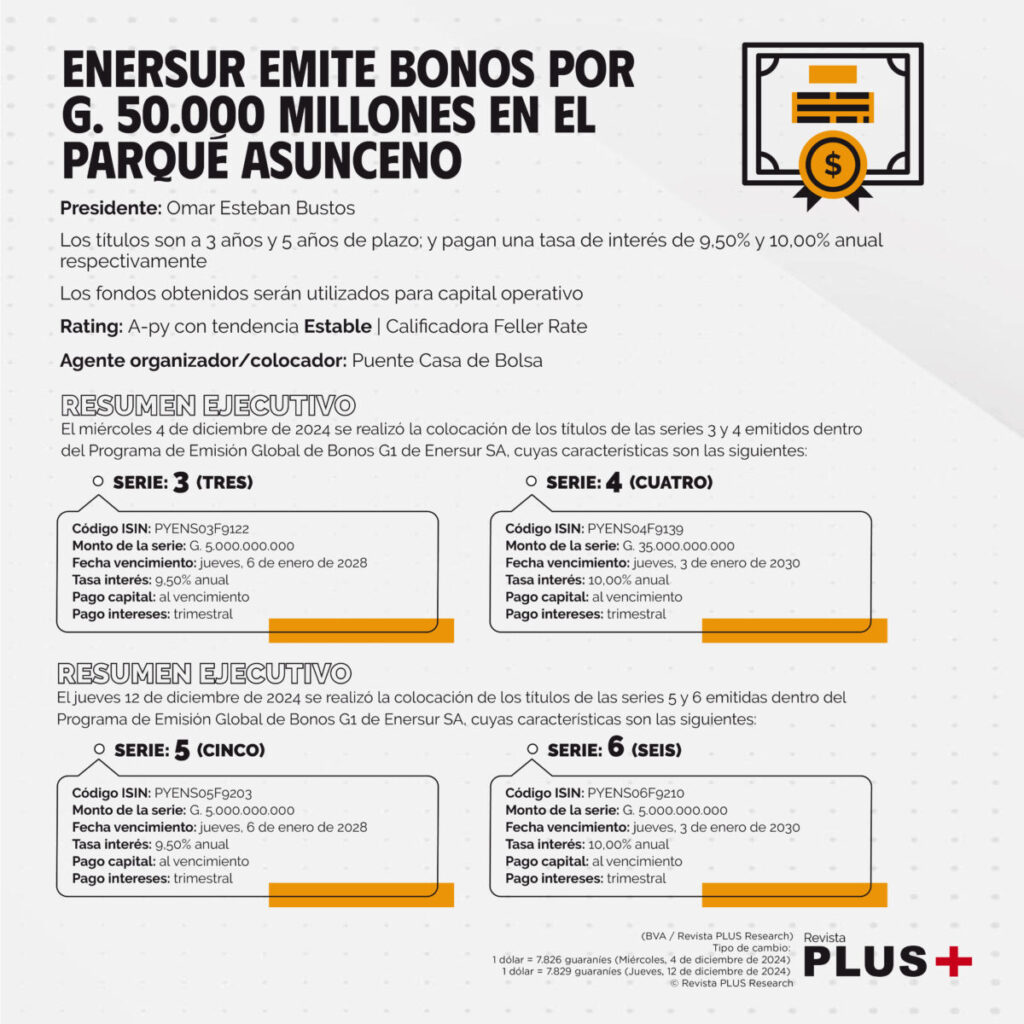 El jueves 12 de diciembre de 2024 se realizó la colocación de los títulos de las series 5 y 6 emitidas dentro del Programa de Emisión Global de Bonos G1 de Enersur SA, cuyas características son las siguientes: