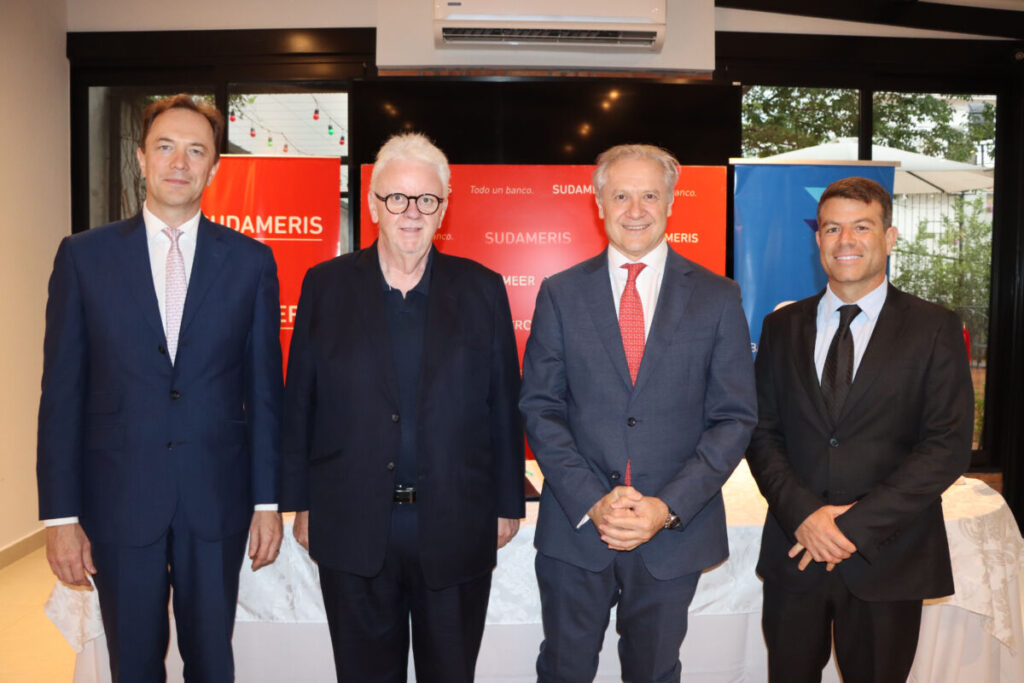 En la foto: Sebastien Lahaie, vicepresidente de Sudameris; Conor McEnroy, presidente de Sudameris; Jorge Srur, gerente regional sur de CAF; y Freddy Puente, ejecutivo principal del sector privado de CAF.