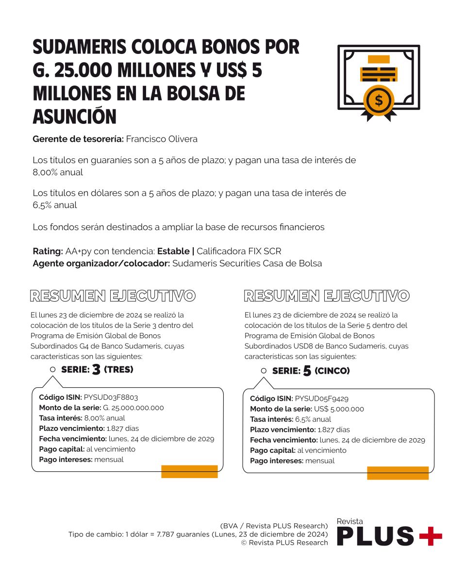 El lunes 23 de diciembre de 2024 se realizó la colocación de los títulos de la Serie 5 dentro del Programa de Emisión Global de Bonos Subordinados USD8 de Banco Sudameris, cuyas características son las siguientes: