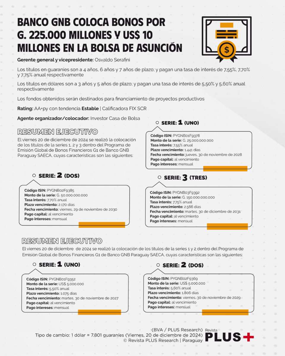 El viernes 20 de diciembre de 2024 se realizó la colocación de los títulos de la series 1 y 2 dentro del Programa de Emisión Global de Bonos Financieros G1 de Banco GNB Paraguay SAECA, cuyas características son las siguientes: