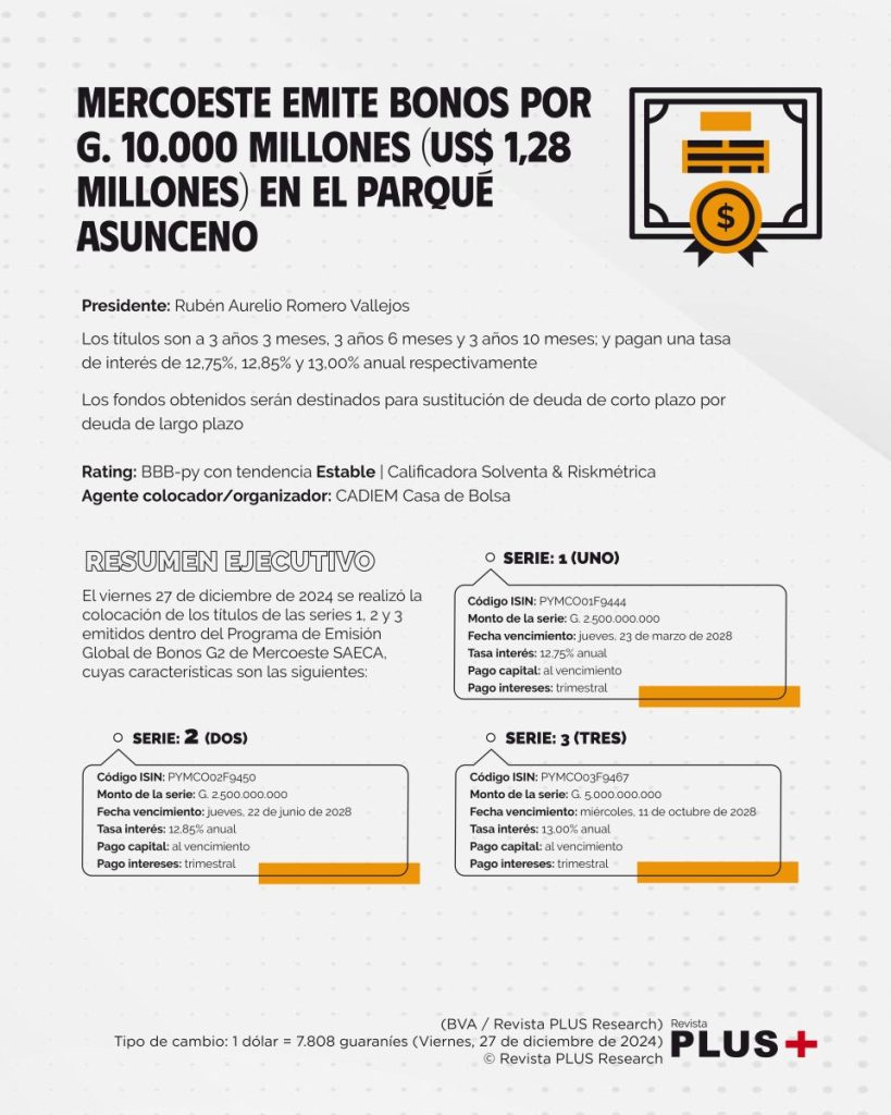 El viernes 27 de diciembre de 2024 se realizó la colocación de los títulos de las series 1, 2 y 3 emitidos dentro del Programa de Emisión Global de Bonos G2 de Mercoeste SAECA, cuyas características son las siguientes: