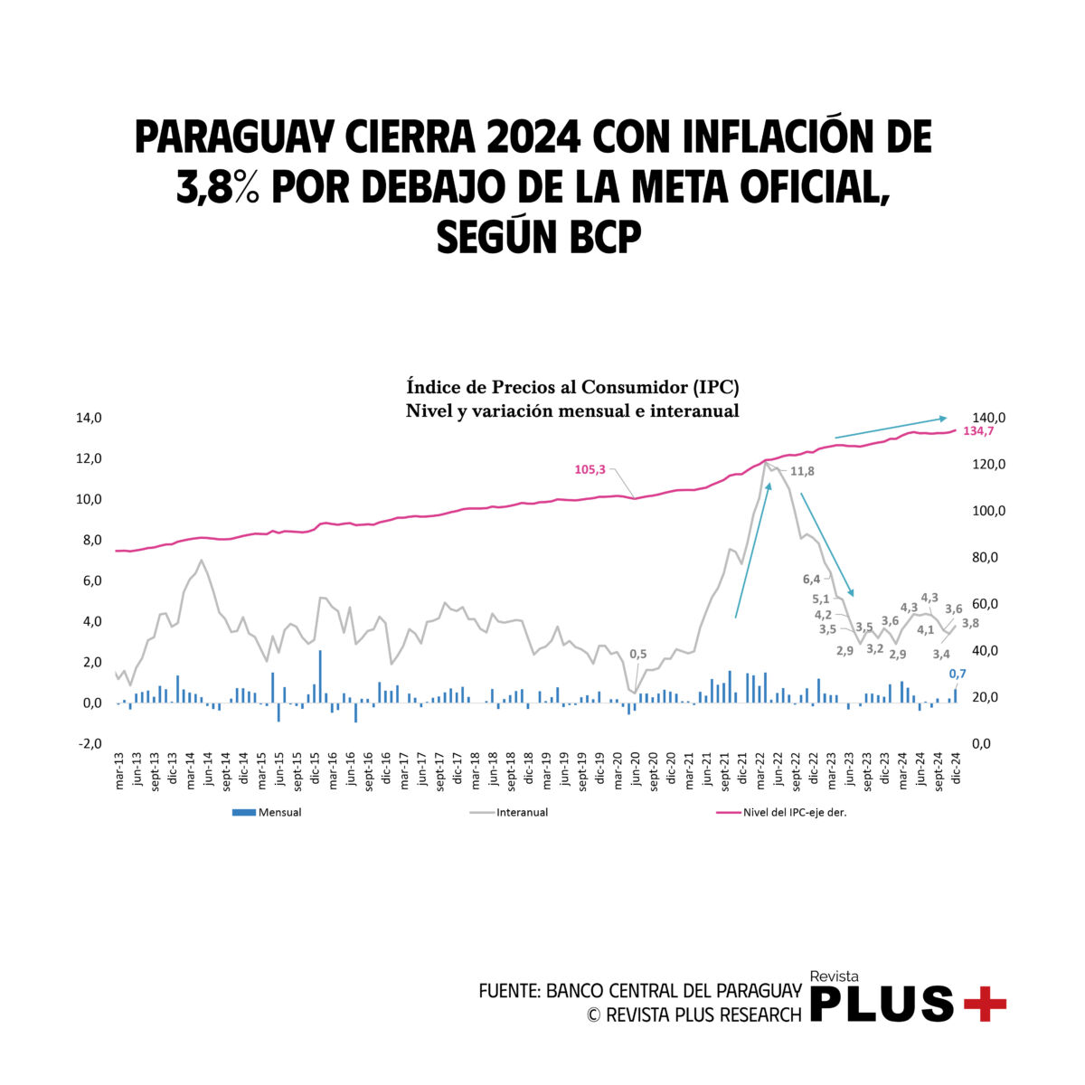 La inflación interanual (diciembre 2023-diciembre 2024) se situó igualmente en 3,8 %, señaló en un informe el Banco Central del Paraguay (BCP).
