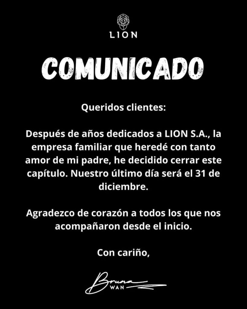 El documento socializado por Wan en su Instagram refiere que la empresa Lion SA fue una parte fundamental de su vida ya que es una empresa familiar que heredó con mucho amor de mi padre y que administró con el mayor compromiso y dedicación a lo largo de los años.
