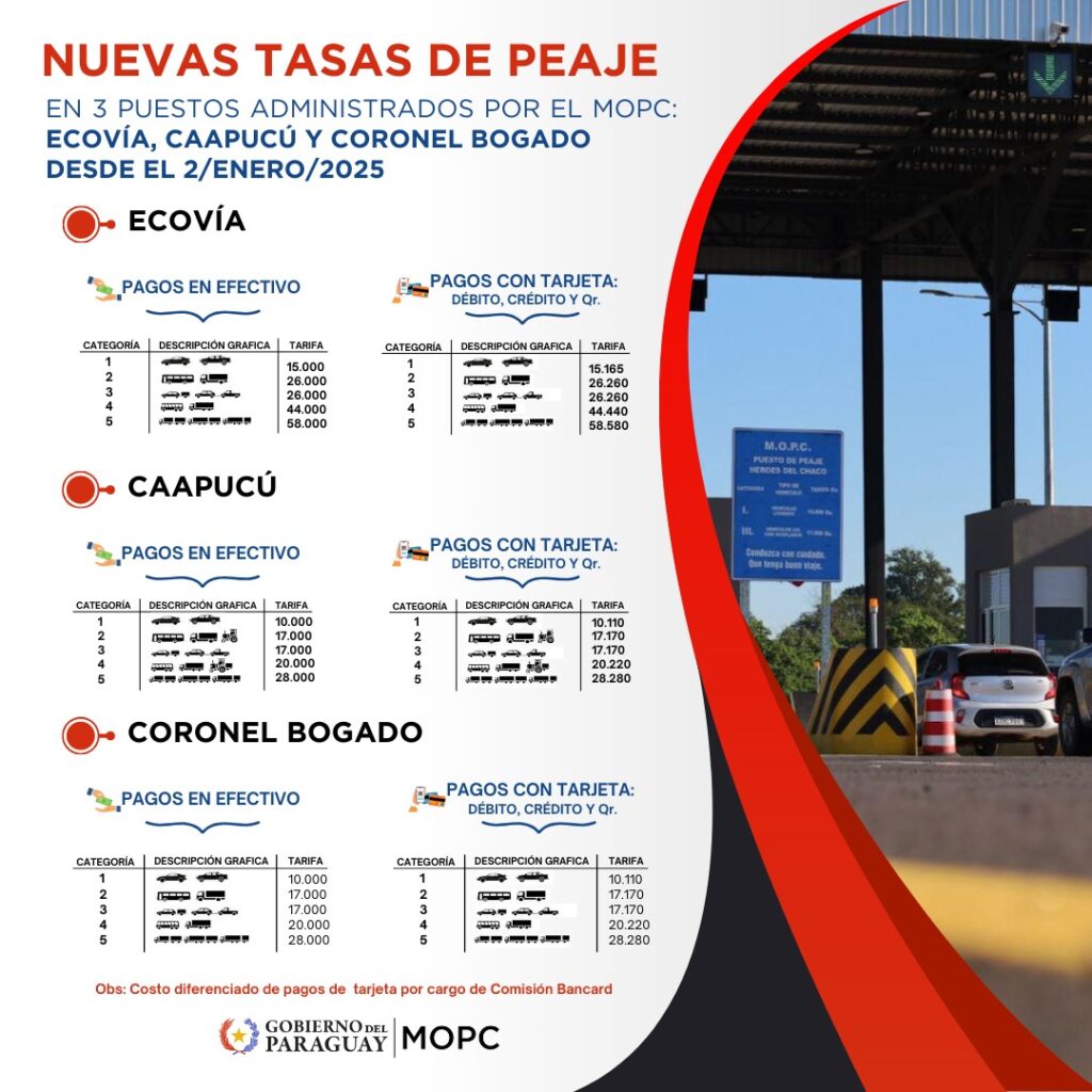 El Ministerio de Obras Públicas y Comunicaciones (MOPC) estableció nuevas tasas de peaje que empezarán a regir desde el 2 de enero de 2025 en tres puestos administrados por la cartera del Estado: Ecovía, Caapucú y Coronel Bogado. Esta nueva disposición se da mediante la Resolución N° 2.471.