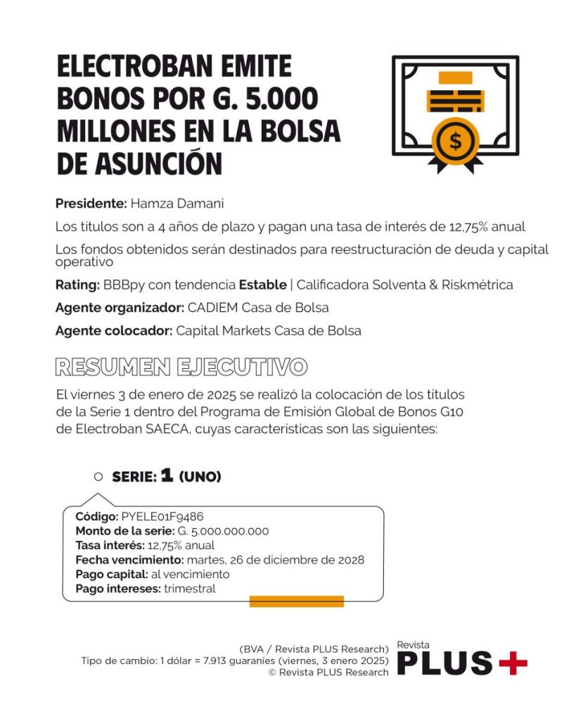 El viernes 3 de enero de 2025 se realizó la colocación de los títulos de la Serie 1 dentro del Programa de Emisión Global de Bonos G10 de Electroban SAECA, cuyas características son las siguientes: