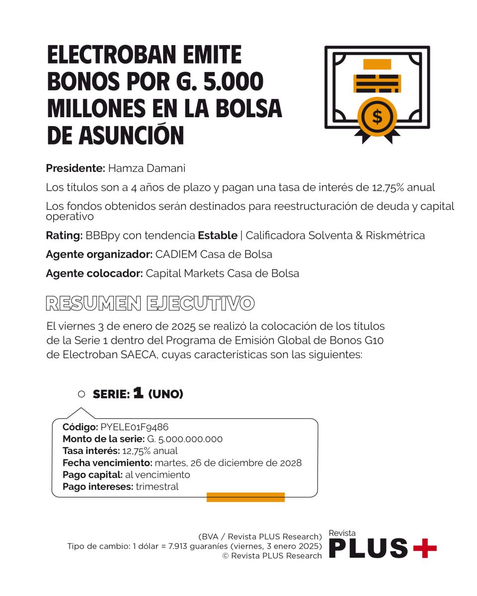 El viernes 3 de enero de 2025 se realizó la colocación de los títulos de la Serie 1 dentro del Programa de Emisión Global de Bonos G10 de Electroban SAECA, cuyas características son las siguientes: