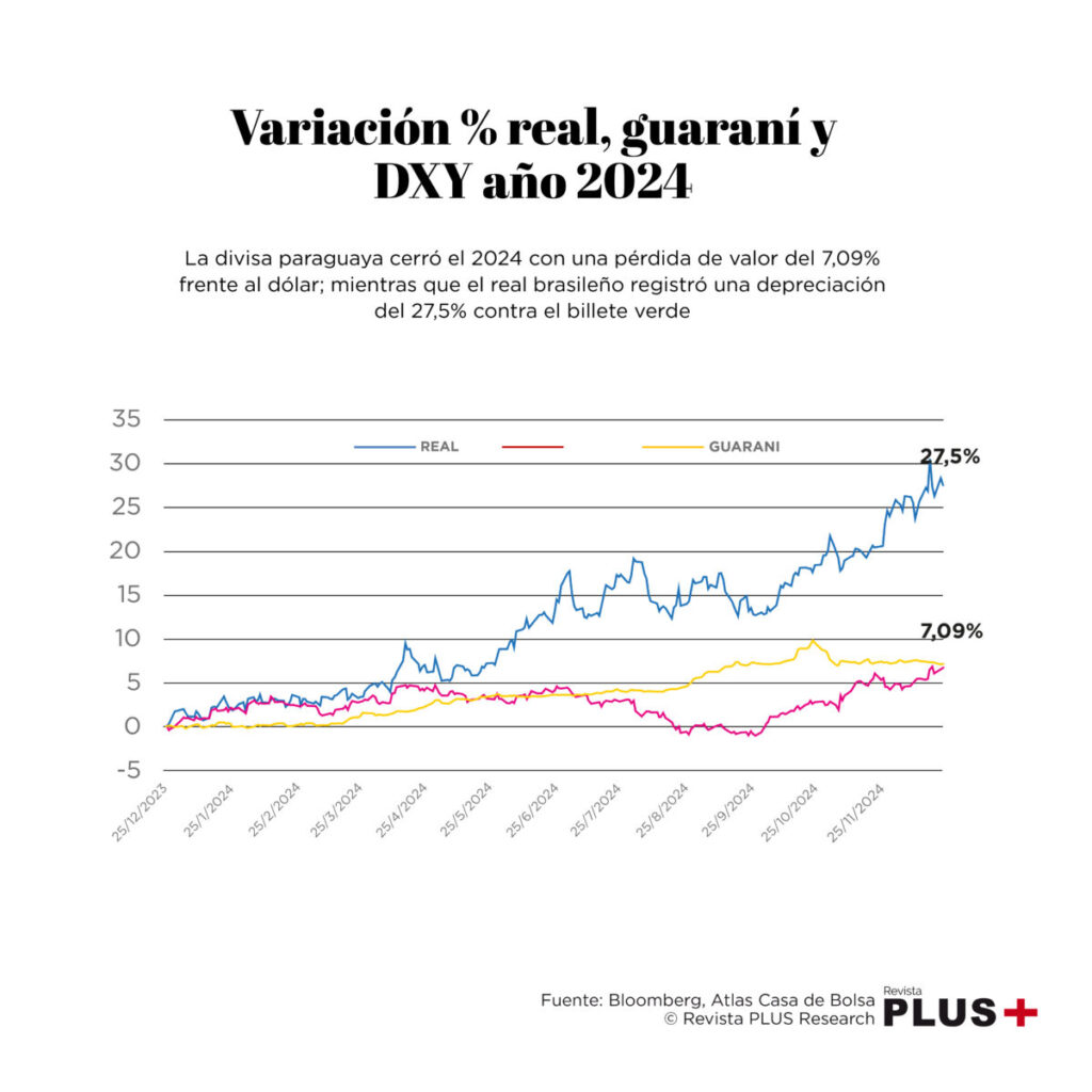 La divisa paraguaya cerró el año pasado con una pérdida de valor del 7% frente al dólar, mientras que el real brasileño registró una depreciación del 27% contra el billete verde.