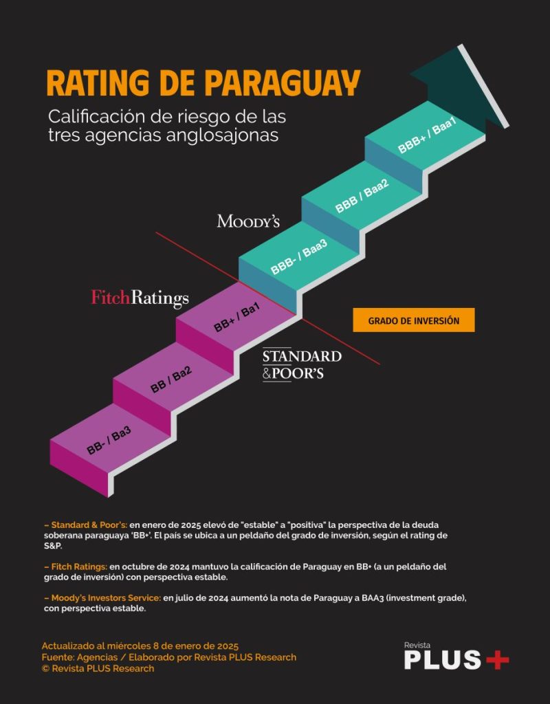 – Standard & Poor’s: en enero de 2025 elevó de «estable» a «positiva» la perspectiva de la deuda soberana paraguaya ‘BB+’. El país se ubica a un peldaño del grado de inversión, según el rating de S&P.