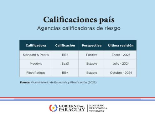En julio del año pasado, Paraguay había alcanzado el grado de inversión, reconocido por la calificadora de riesgo Moody’s. «Nuestro anhelo es que lo más rápido posible las tres calificadoras de riesgo, S&P, Moddy’s y Fitch, puedan reconocer y validar que el Paraguay es un país predecible, serio, responsable, que implementa políticas económicas y que fortalece sus instituciones», dijo hoy el mandatario.