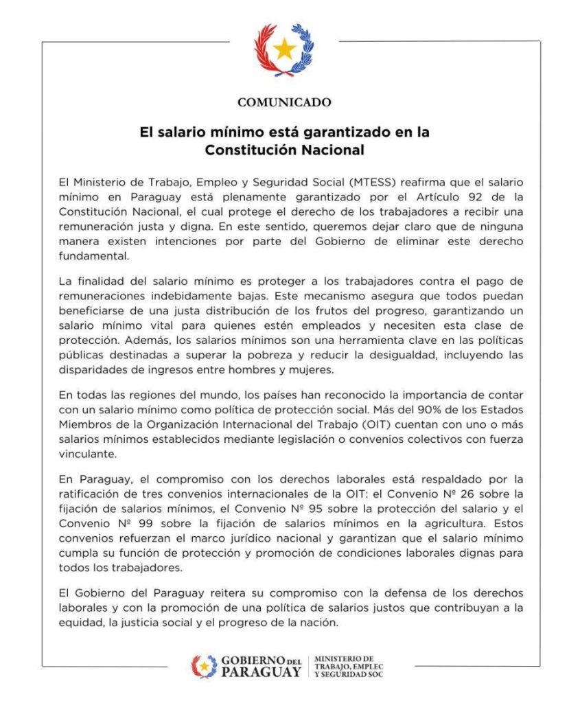 El Ministerio de Trabajo, Empleo y Seguridad Social (Mtess) emitió un comunicado recordando que el salario mínimo en Paraguay está plenamente garantizado por el Artículo 92 de la Constitución Nacional, el cual protege el derecho de los trabajadores a recibir una remuneración justa y digna.