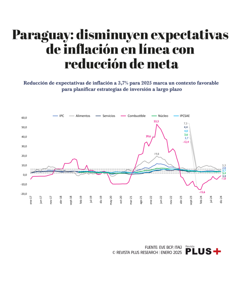 Asunción (Paraguay).- La economía paraguaya sigue mostrando signos de fortaleza. Las expectativas de inflación han disminuido ubicándose en 3,7% para 2025, según una reciente encuesta del BCP.