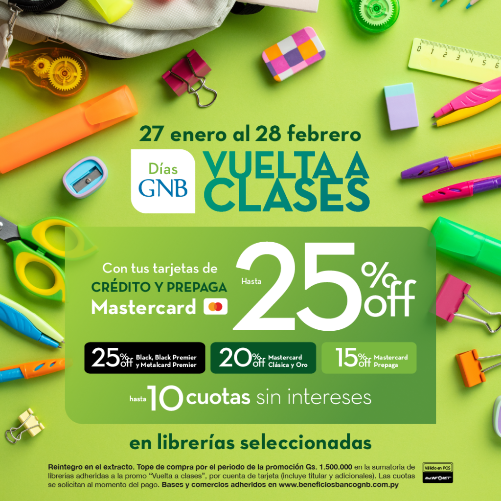 Banco GNB lanza una promoción ideal para aquellos que se preparan para la vuelta a clases. Hasta el 28 de febrero de 2025, los clientes con tarjetas de crédito Mastercard y prepaga de Banco GNB podrán disfrutar de descuentos exclusivos vía reintegro en librerías seleccionadas.