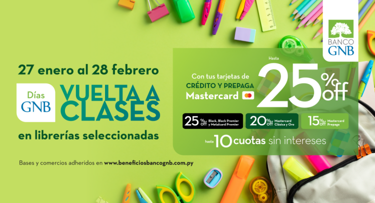 Banco GNB lanza una promoción ideal para aquellos que se preparan para la vuelta a clases. Hasta el 28 de febrero de 2025, los clientes con tarjetas de crédito Mastercard y prepaga de Banco GNB podrán disfrutar de descuentos exclusivos vía reintegro en librerías seleccionadas.