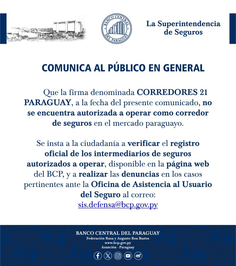 La Superintendencia de Seguros del Banco Central del Paraguay (BCP) comunica que la firma denominada Corredores 21 Paraguay, a la fecha 12 de febrero del 2025, no se encuentra autorizada a operar como corredor de seguros en el mercado paraguayo.