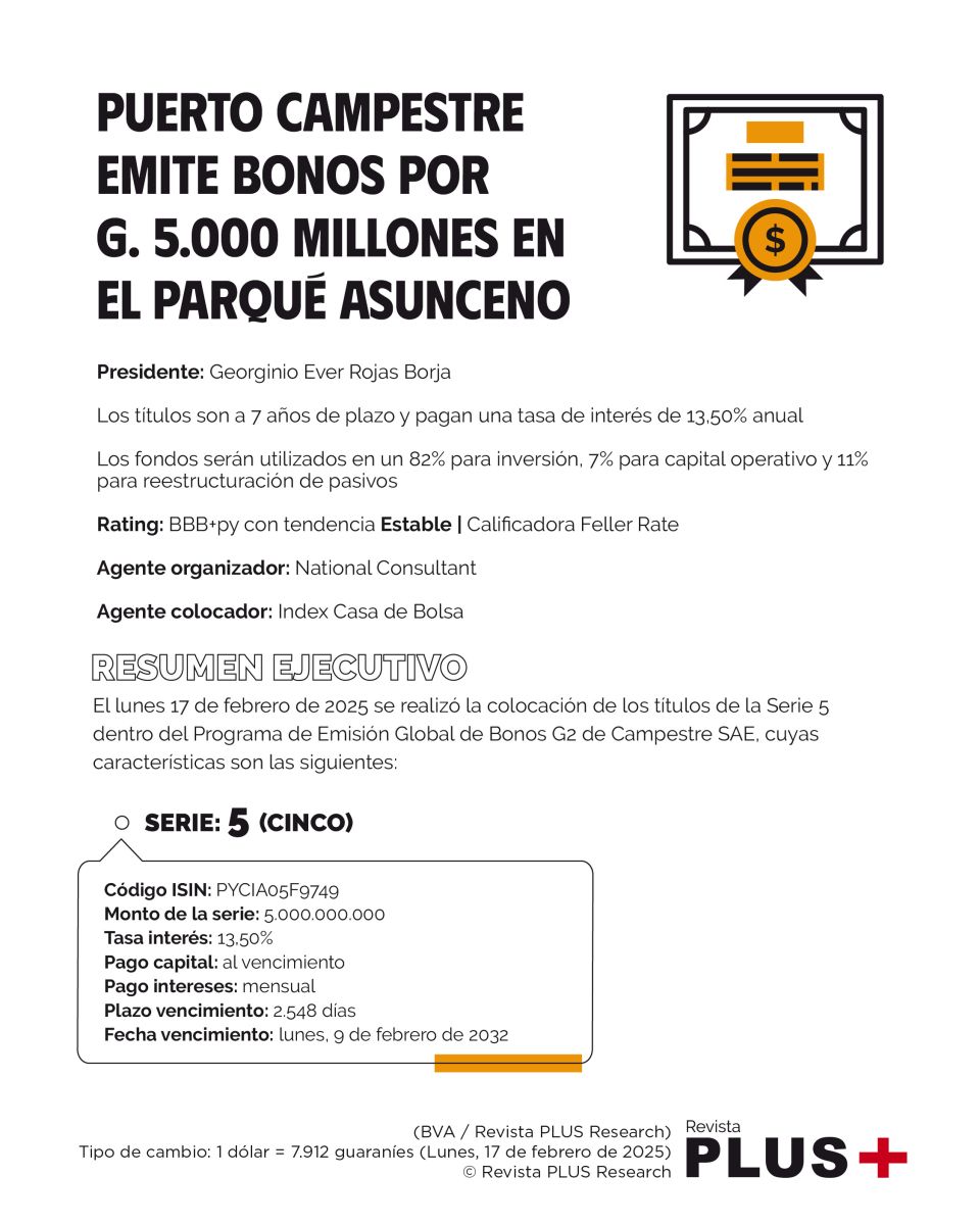 El lunes 17 de febrero de 2025 se realizó la colocación de los títulos de la Serie 5 dentro del Programa de Emisión Global de Bonos G2 de Campestre SAE, cuyas características son las siguientes: