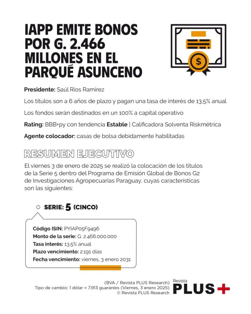El viernes 3 de enero de 2025 se realizó la colocación de los títulos de la Serie 5 dentro del Programa de Emisión Global de Bonos G2 de Investigaciones Agropecuarias Paraguay, cuyas características son las siguientes: