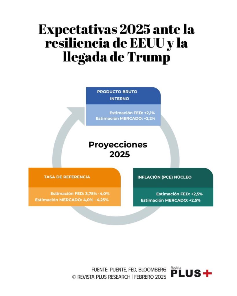 Especial Perspectivas 2025 | Revista PLUS.- La economía estadounidense cerró el cuarto trimestre de 2024 con un crecimiento del +2,3% anualizado, inferior a las expectativas (+2,6% anualizado), lo que refleja la resiliencia de la actividad pese al alto nivel en la tasa de interés de referencia en gran parte del año.