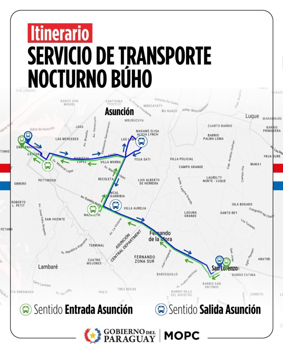 Los buses del servicio nocturno, identificados como B1, tienen un costo de G. 3.400 y recorren puntos estratégicos de Asunción y San Lorenzo.