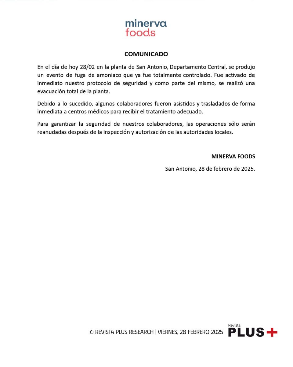 Asunción, 28 feb (EFE).- Al menos 78 trabajadores resultaron afectados este viernes por una presunta fuga de amoniaco en una planta frigorífica del grupo brasileño Minerva Foods, en la ciudad paraguaya de San Antonio (centro), lo que obligó a las autoridades a solicitar la evacuación de un radio mínimo de cinco cuadras, informaron fuentes sanitarias y de la Policía Nacional.