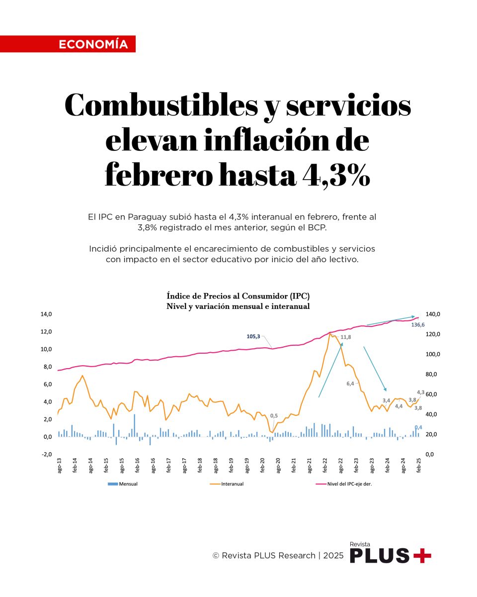 Asunción, 4 mar (EFE).- La inflación en Paraguay se elevó hasta el 4,3 % interanual en febrero, frente al 3,8 % registrado el mes anterior, debido principalmente al encarecimiento de los combustibles y los servicios con un impacto destacado en el sector educativo por al inicio del año lectivo, según el ente emisor.