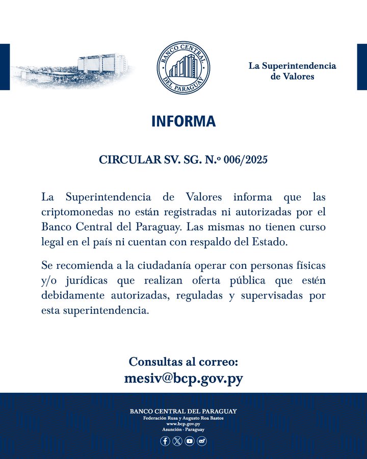 Mediante la circular N.º 006/2025, la Superintendencia de Valores informa que las criptomonedas no están registradas ni autorizadas por el Banco Central del Paraguay. Las mismas no tienen curso legal en el país ni cuentan con respaldo del Estado.