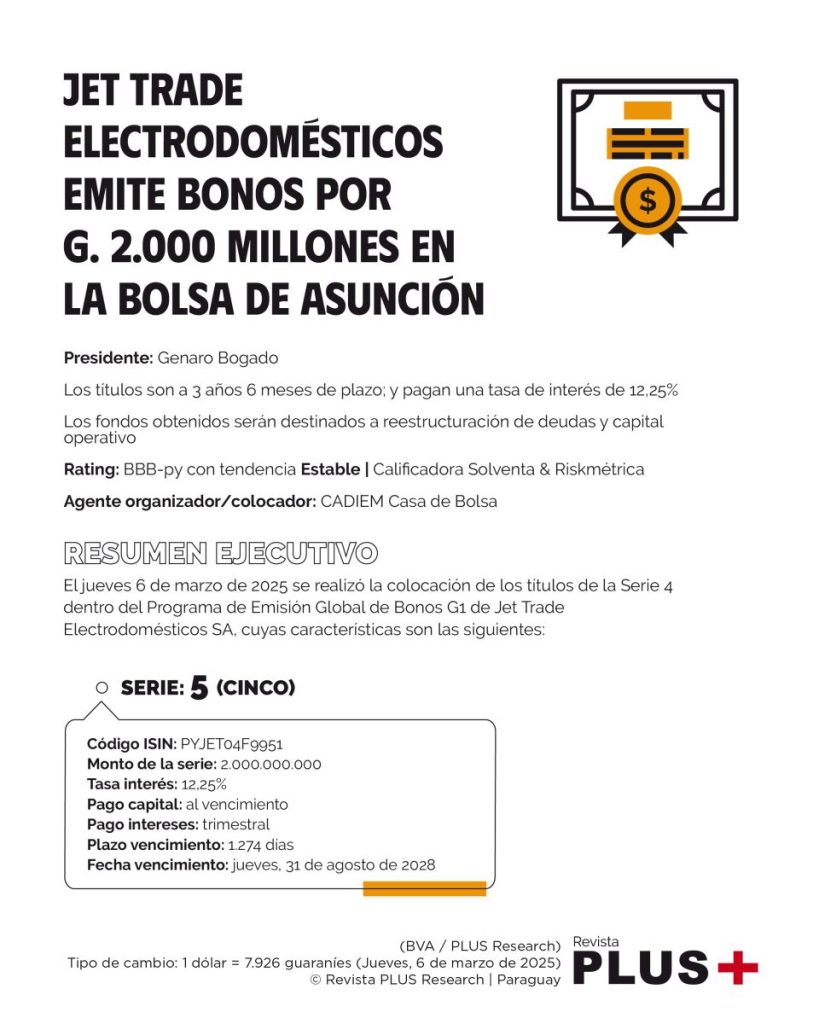 Asunción (Paraguay).- Jet Trade Electrodomésticos es una empresa paraguaya con 16 años de trayectoria, fundada y dirigida por la familia Bogado Orué. Se especializa en la comercialización de electrométricos, productos electrónicos y bienes para el hogar a través de su marca “Electrojet“. Cuenta con una casa central en Asunción y 16 sucursales distribuidas en el territorio nacional.