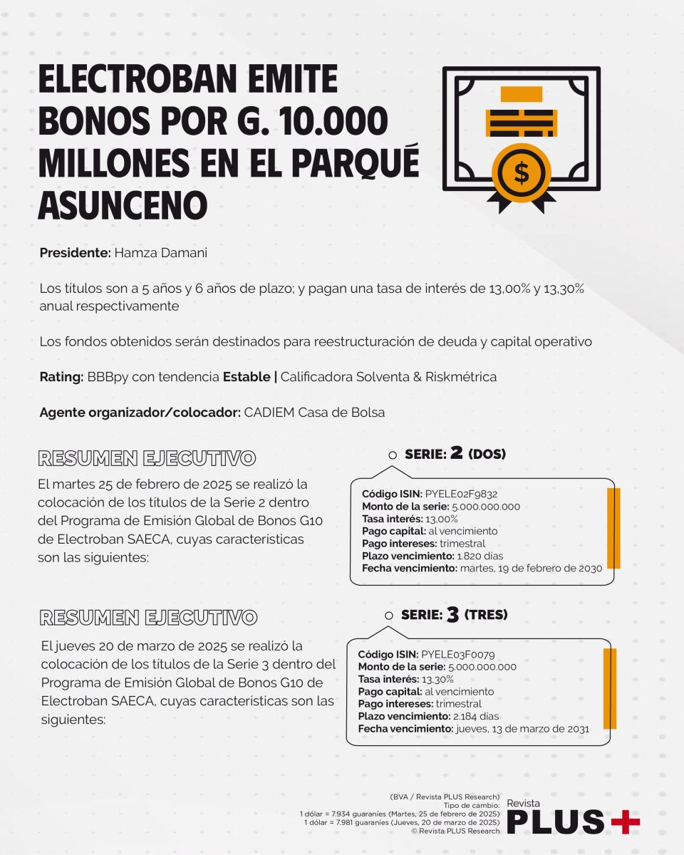 El martes 25 de febrero de 2025 se realizó la colocación de los títulos de la Serie 2 dentro del Programa de Emisión Global de Bonos G10 de Electroban SAECA, cuyas características son las siguientes: