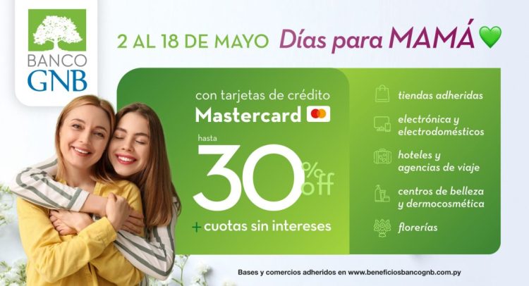 Como es habitual, el Banco GNB siempre está presente en las principales fechas especiales para ofrecer una gama variada de beneficios que permiten disfrutar y ahorrar a sus clientes. En esta ocasión, del 2 al 18 de mayo y con hasta 30% de reintegro, los clientes podrán realizar sus compras en los principales rubros de electrónica y electrodomésticos, hoteles, agencias de viaje, tiendas de compras (shoppings), spa, florerías, gastronomía y mucho más para ese regalo y festejo que mamá se merece.