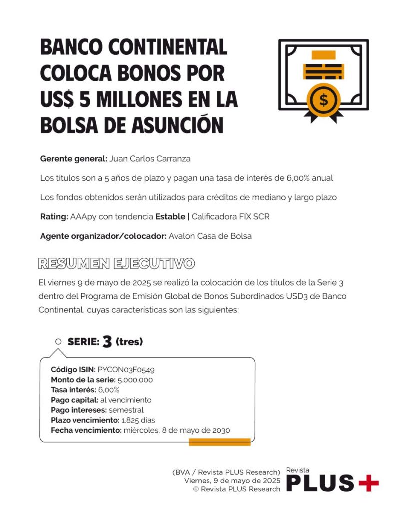 El viernes 9 de mayo de 2025 se realizó la colocación de los títulos de la Serie 3 dentro del Programa de Emisión Global de Bonos Subordinados USD3 de Banco Continental, cuyas características son las siguientes: